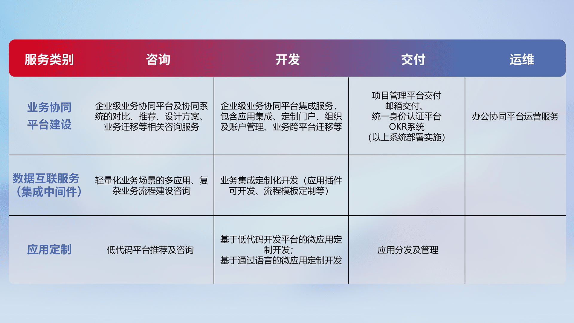 针对钉钉、、、、企微、、、、IDaas等平台级产品提供产品的规划、、、方案、、、交付、、、定制化开发等服务,,,实现如统一协同办公、、、、智能客户服务、、、混合会议管理、、智能数据查询、、等业务场景,,实现数字化转型。。。。